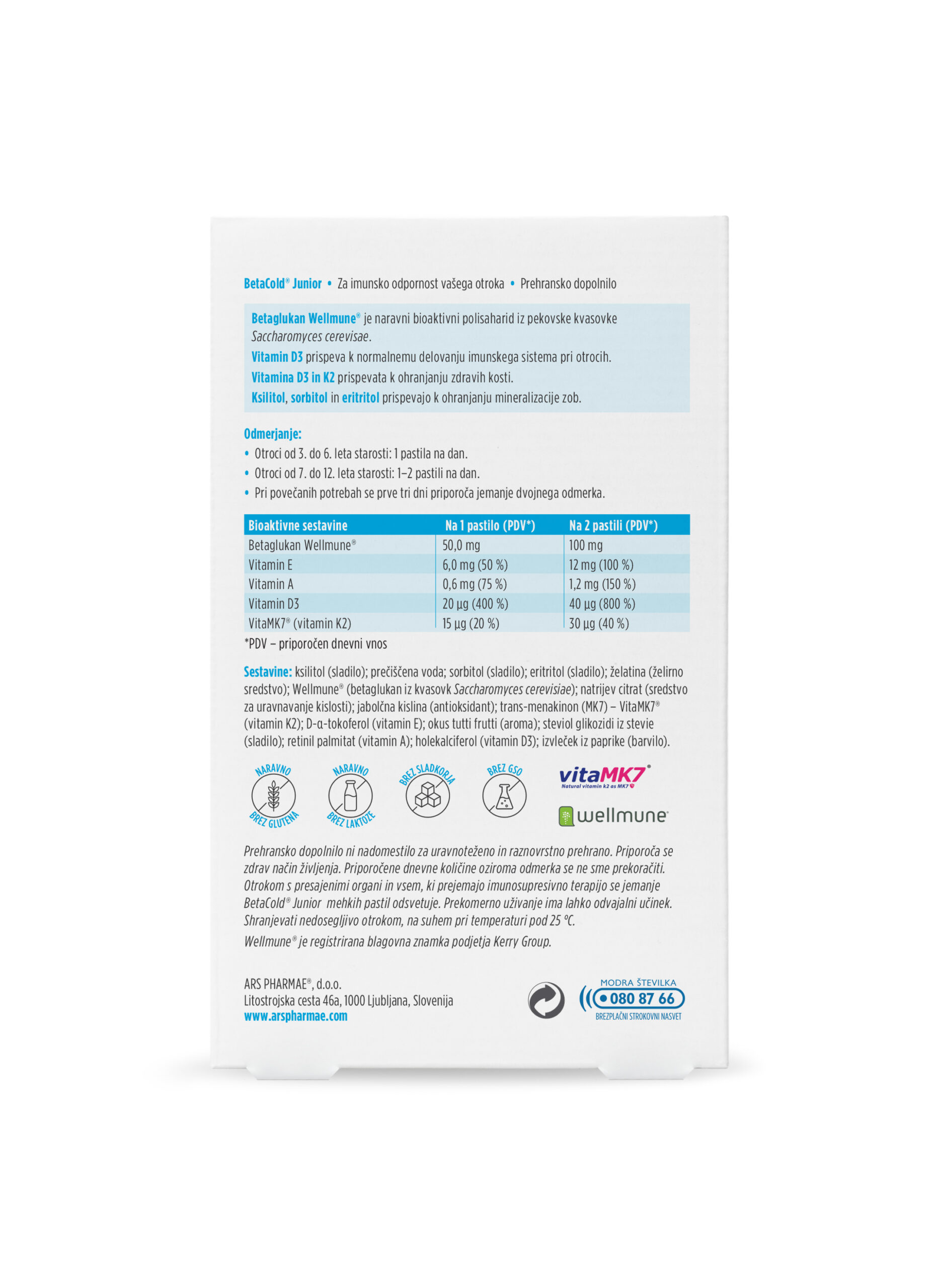 Odmerjanje in način uporabe: BetaCold® Junior mehke pastile dajte otroku pol ure pred jedjo, najbolje zjutraj pred zajtrkom. Otroci od 2. do 6. leta starosti vzamejo 1 pastilo na dan, otroci od 7. do 12. leta starosti vzamejo 1 – 2 pastili na dan, lahko obe pastili hkrati.