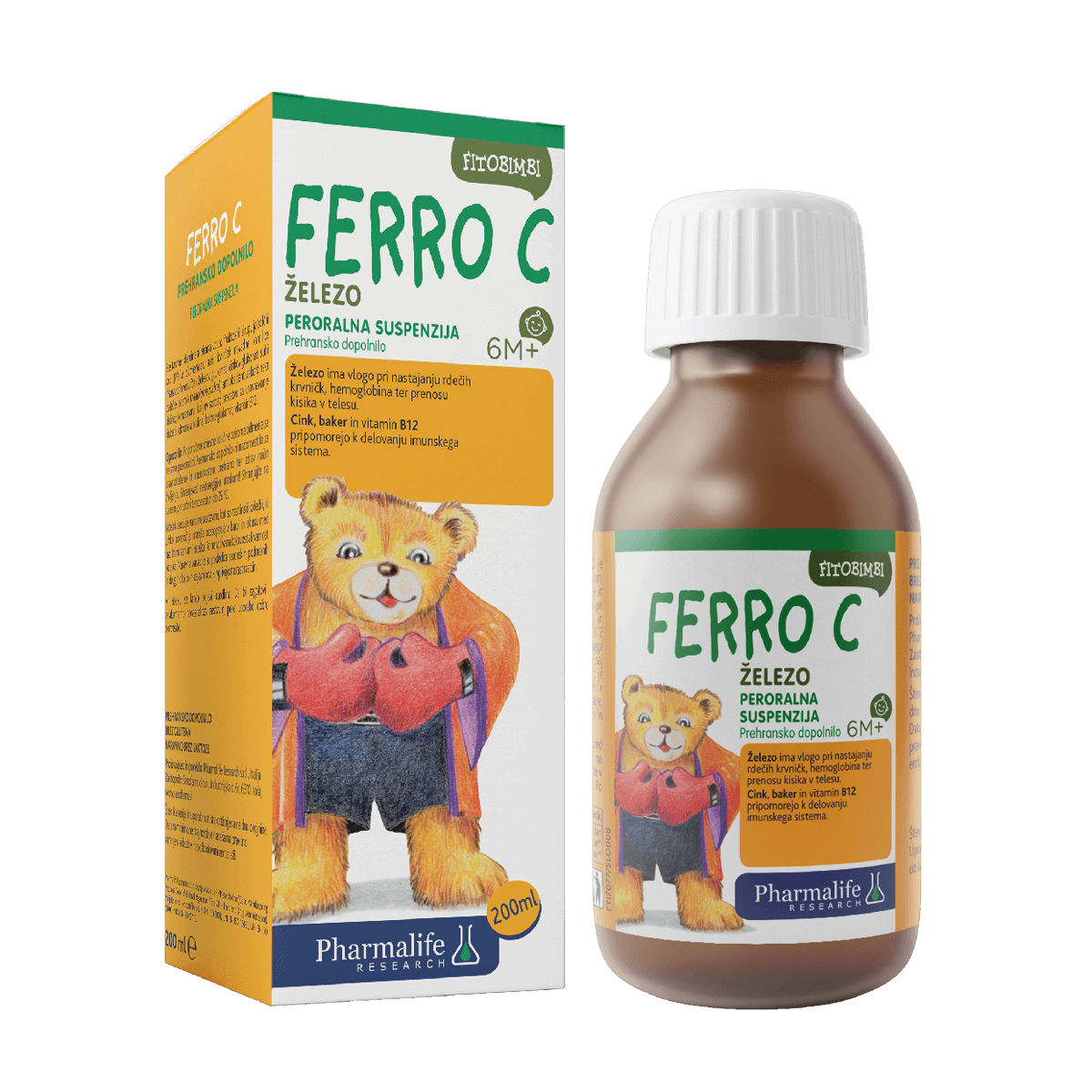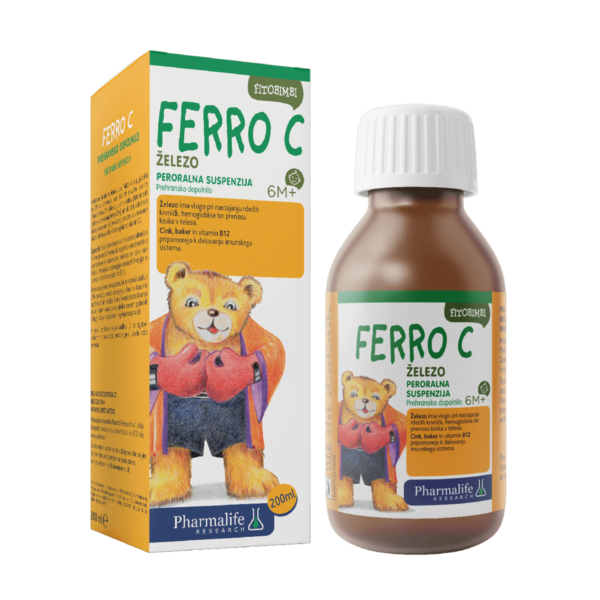 Prehransko dopolnilo FITOBIMBI Ferro C je peroralna suspenzija za otroke z železom, cinkom, bakrom in vitaminom B12 ter izvlečki kamilice in acerole. Ferro C vsebuje železo, ki ima vlogo pri nastajanju rdečih krvničk in hemoglobina in prenosu kisika v telesu. Izdelek vsebuje tudi acerolo, ki je naravni vir vitamina C za večjo absorpcijo železa. Cink, baker in vitamin B12 imajo pomembno vlogo pri delovanju imunskega sistema. Izdelek ne draži želodčne sluznice, saj vsebuje kamilico.