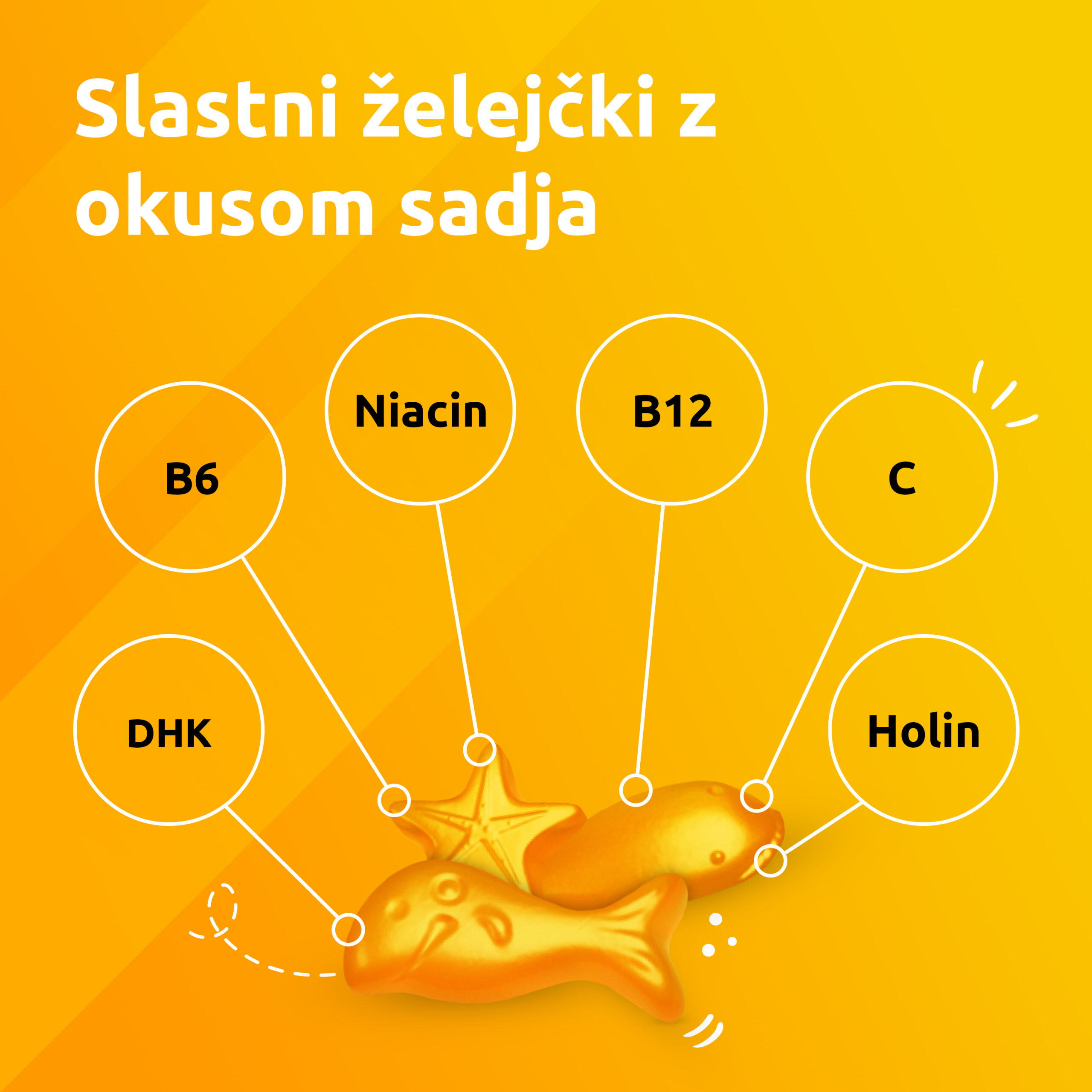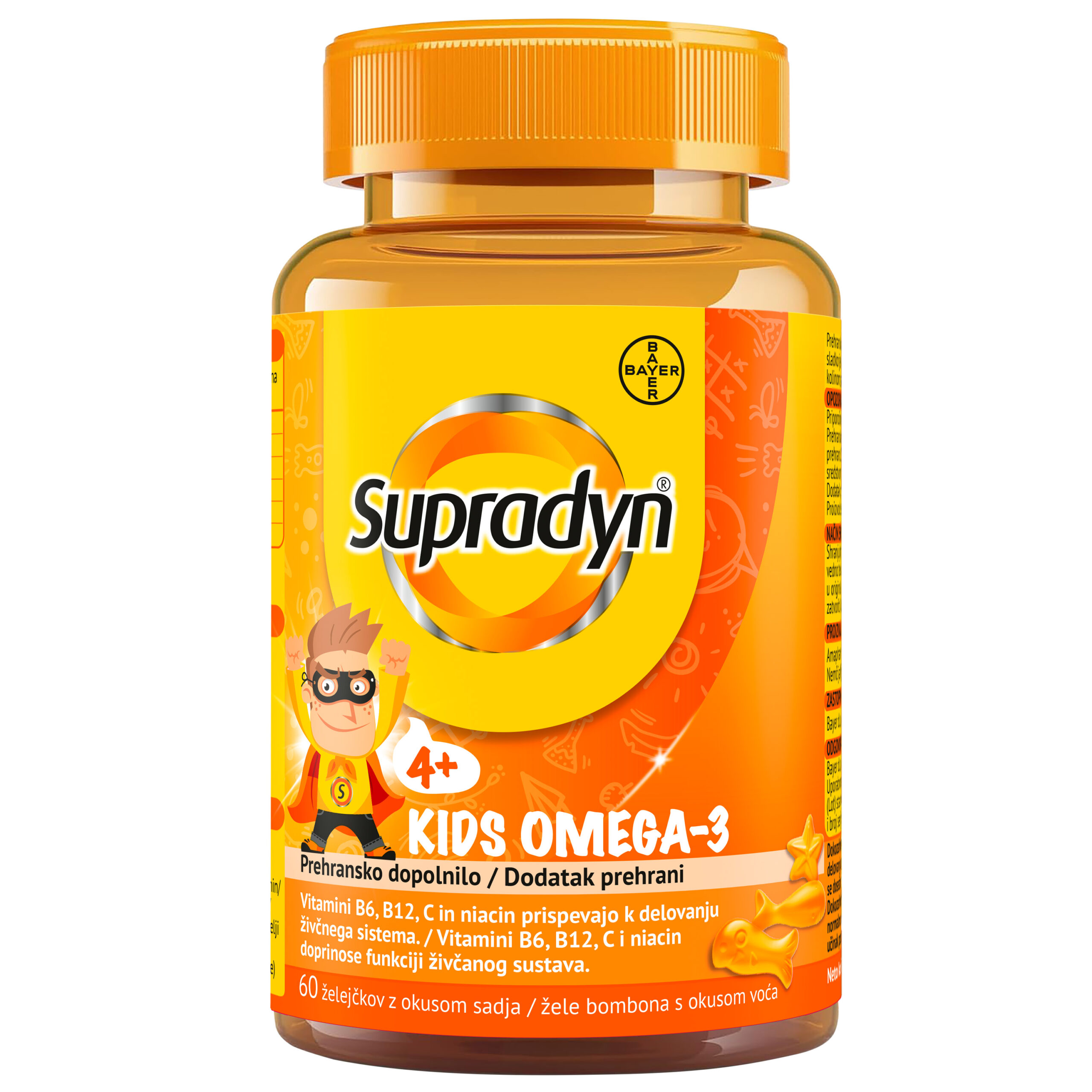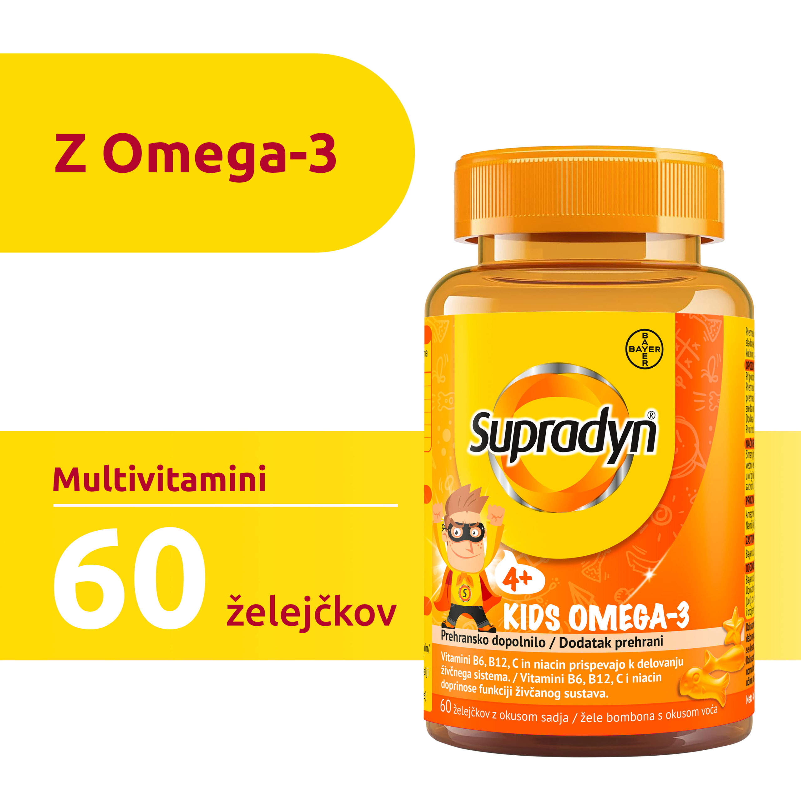 Okusni sadni želejčki Supradyn® Kids Omega-3 vsebujejo edinstveno kombinacijo DHK, ene najpomembnejših omega-3 maščobnih kislin, holina in vitaminov. Od 4. leta dalje.